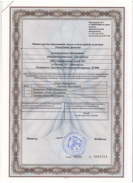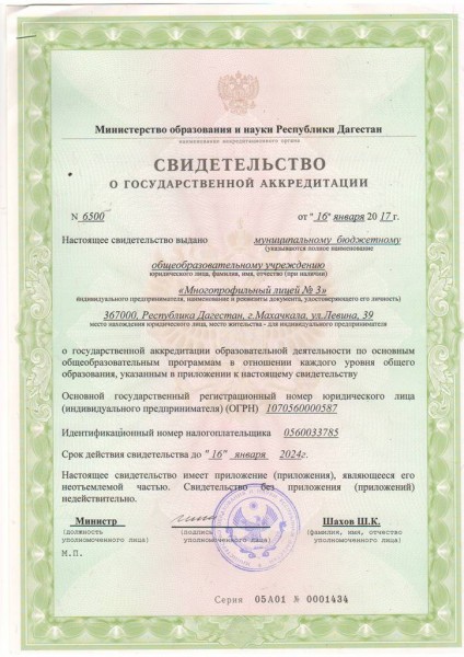 Образовательнаядеятельностьмуниципального бюджетного общеобразовательного учреждения "Многопрофильный лицей №3" города Махачкалы осуществляется по следующим адресам:367000, г. Махачкала, ул. Лёвина, 39