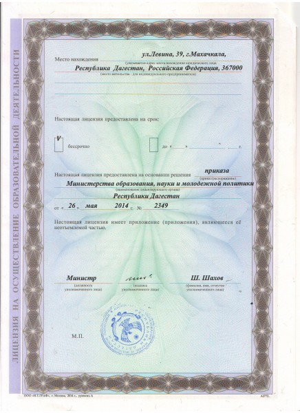 | Адрес местонахождения образовательной организации* | 367000, Республика Дагестан г. Махачкала, ул. Левина 39 |